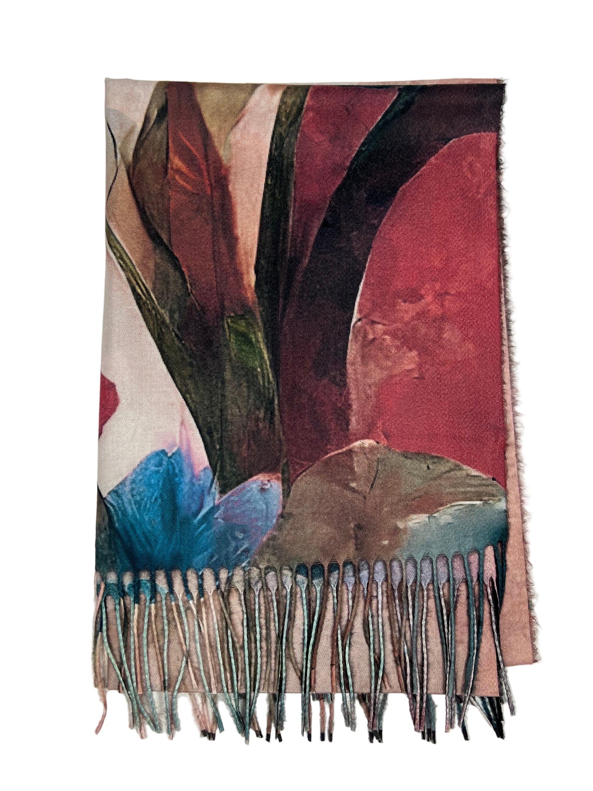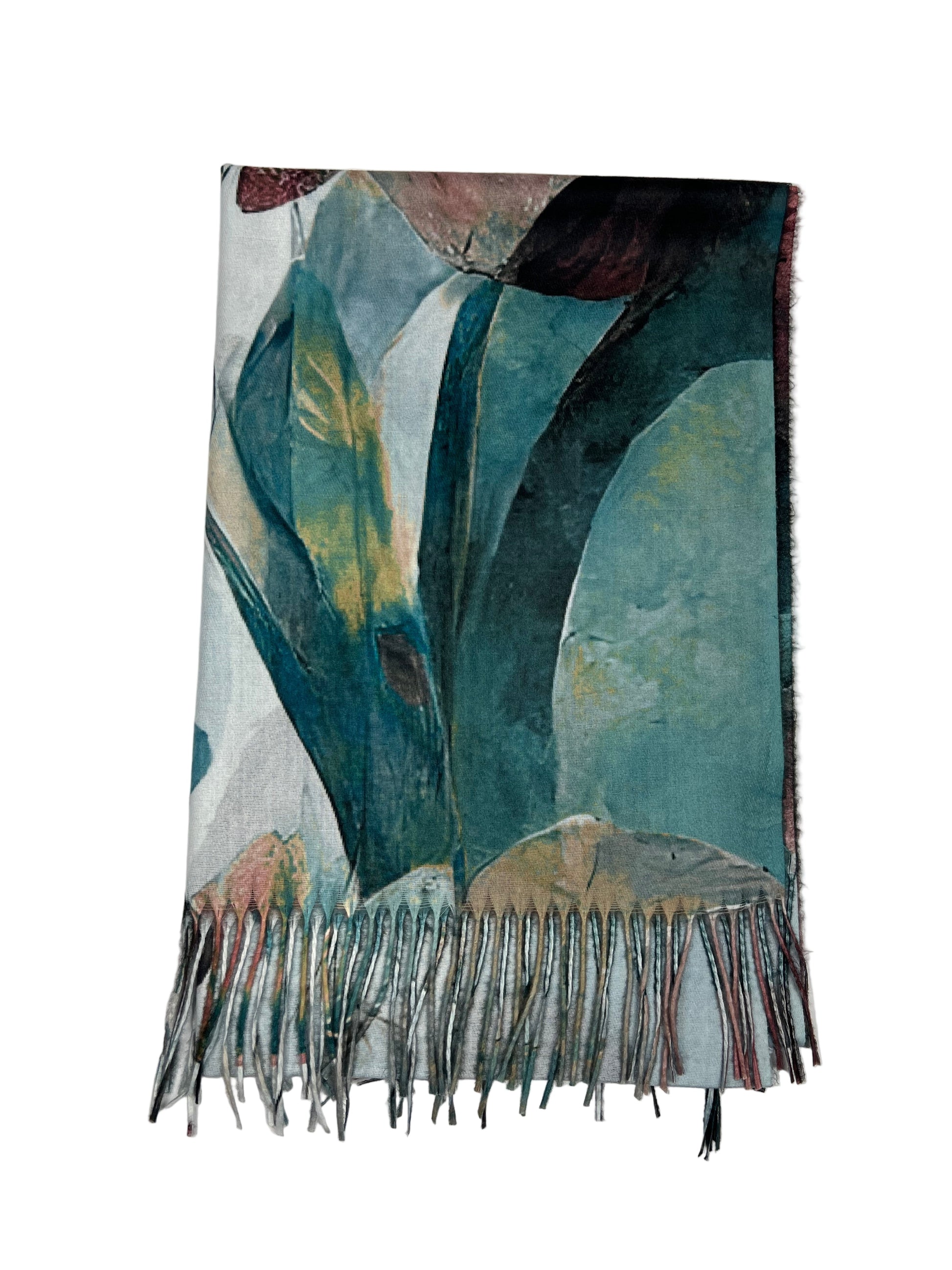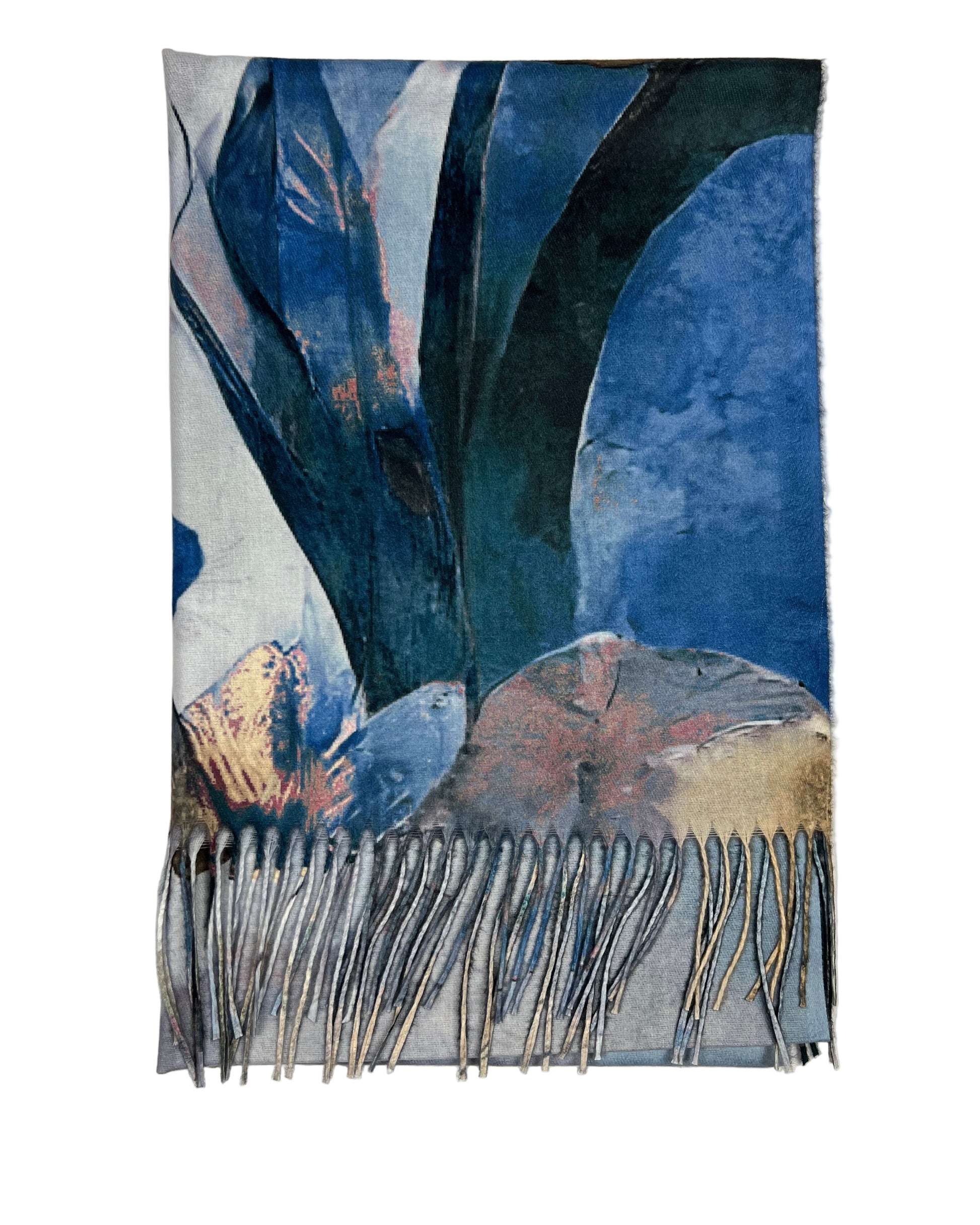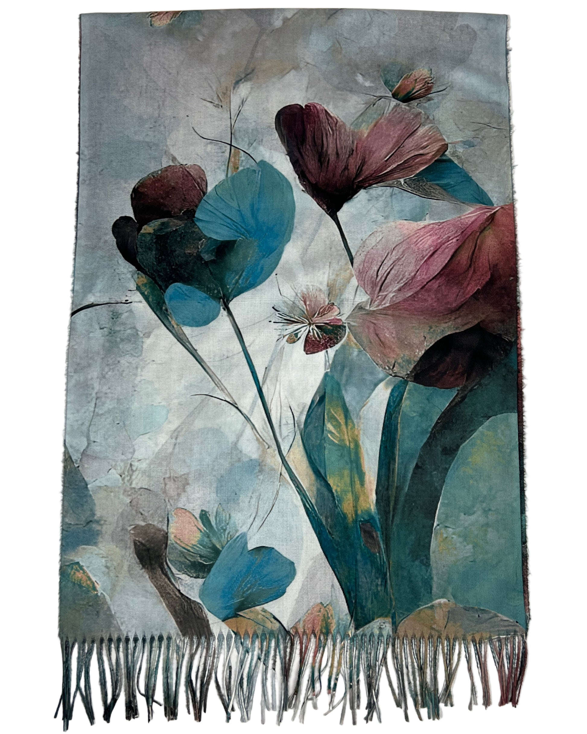 Subtilus šalikas su meninio stiliaus gėlių motyvais. Dominuoja melsvos ir bordo spalvos, kurios suteikia elegancijos bei išskirtinumo. Tobulas pasirinkimas prie neutralių tonų aprangos.