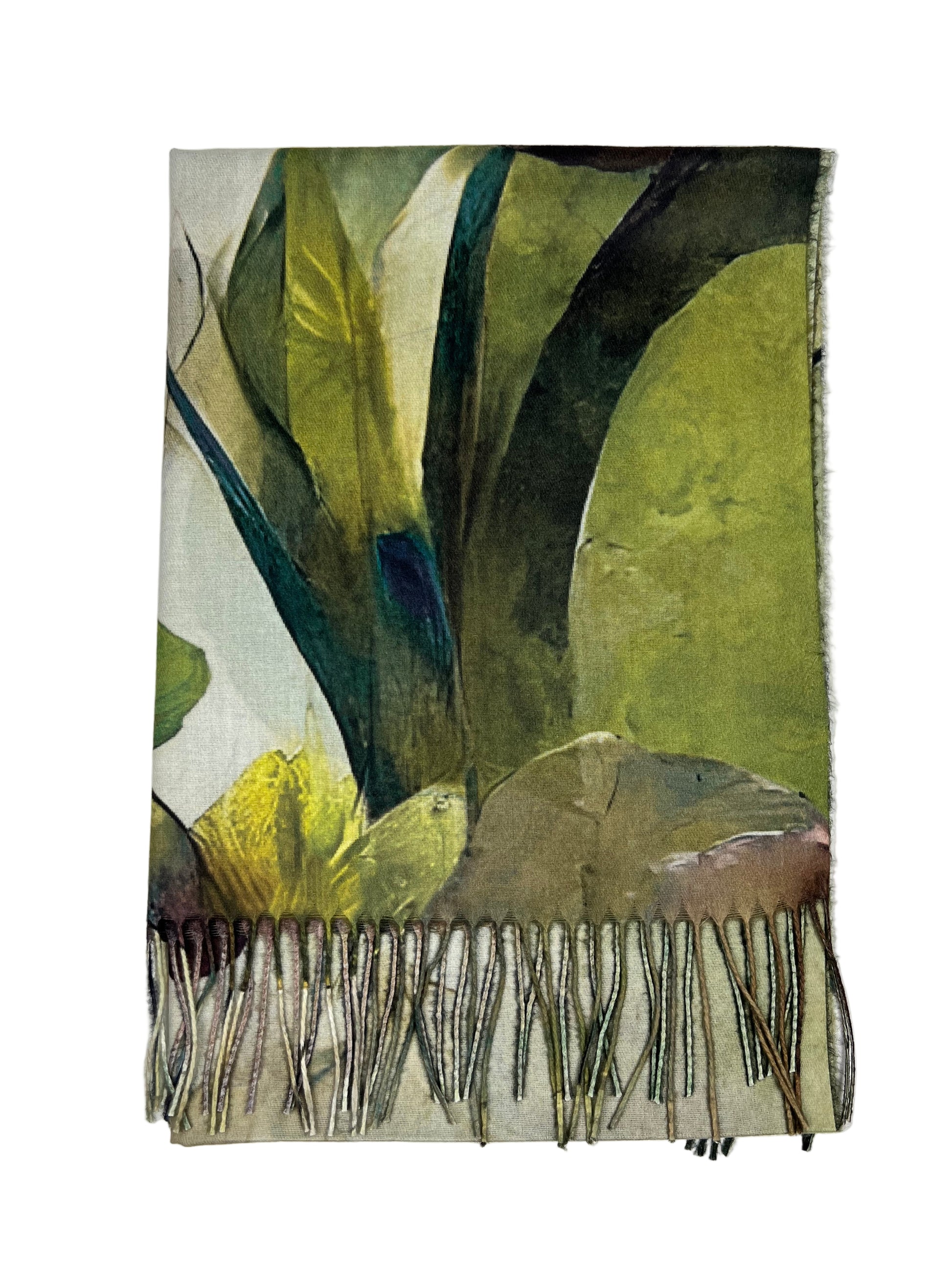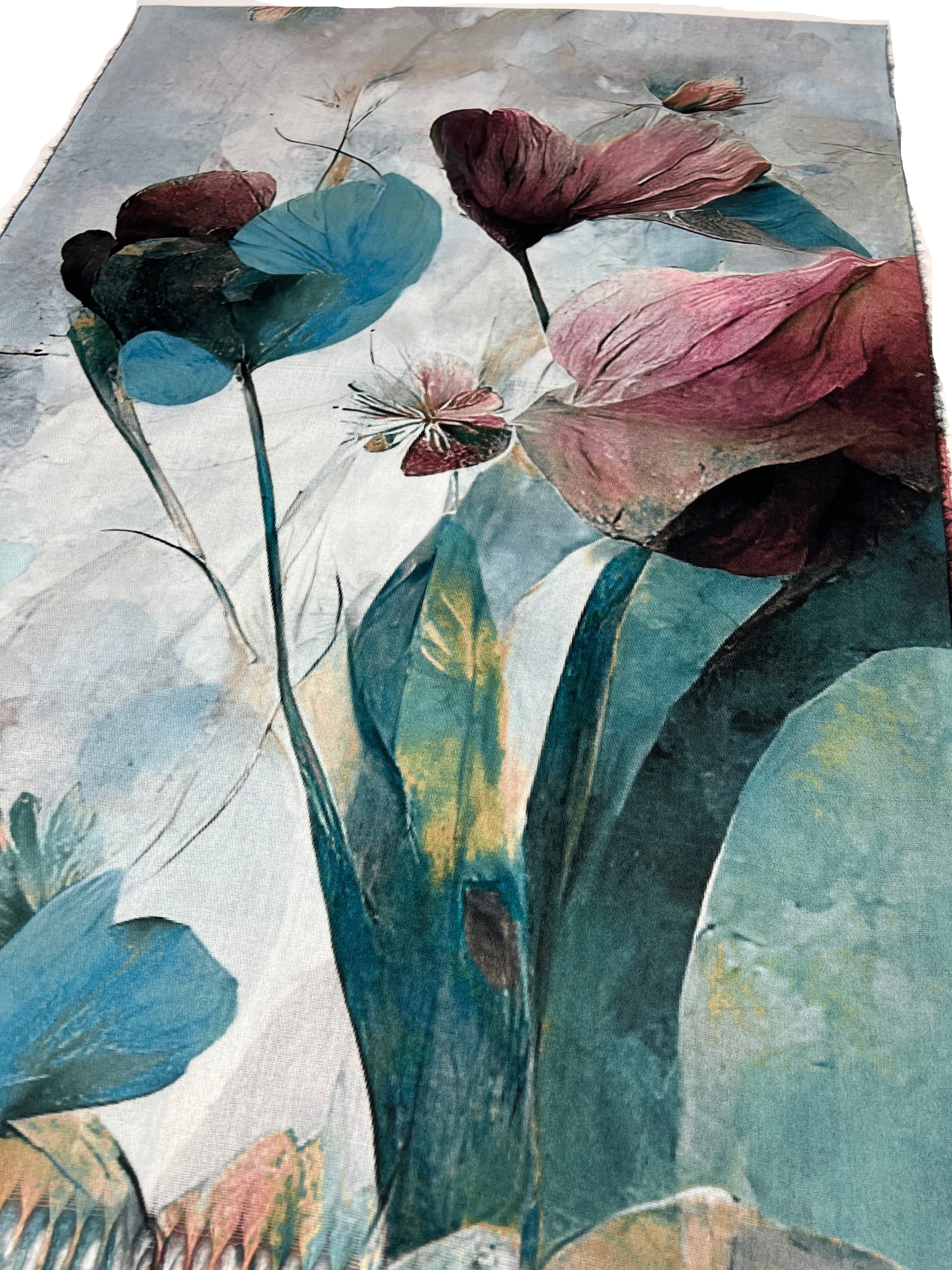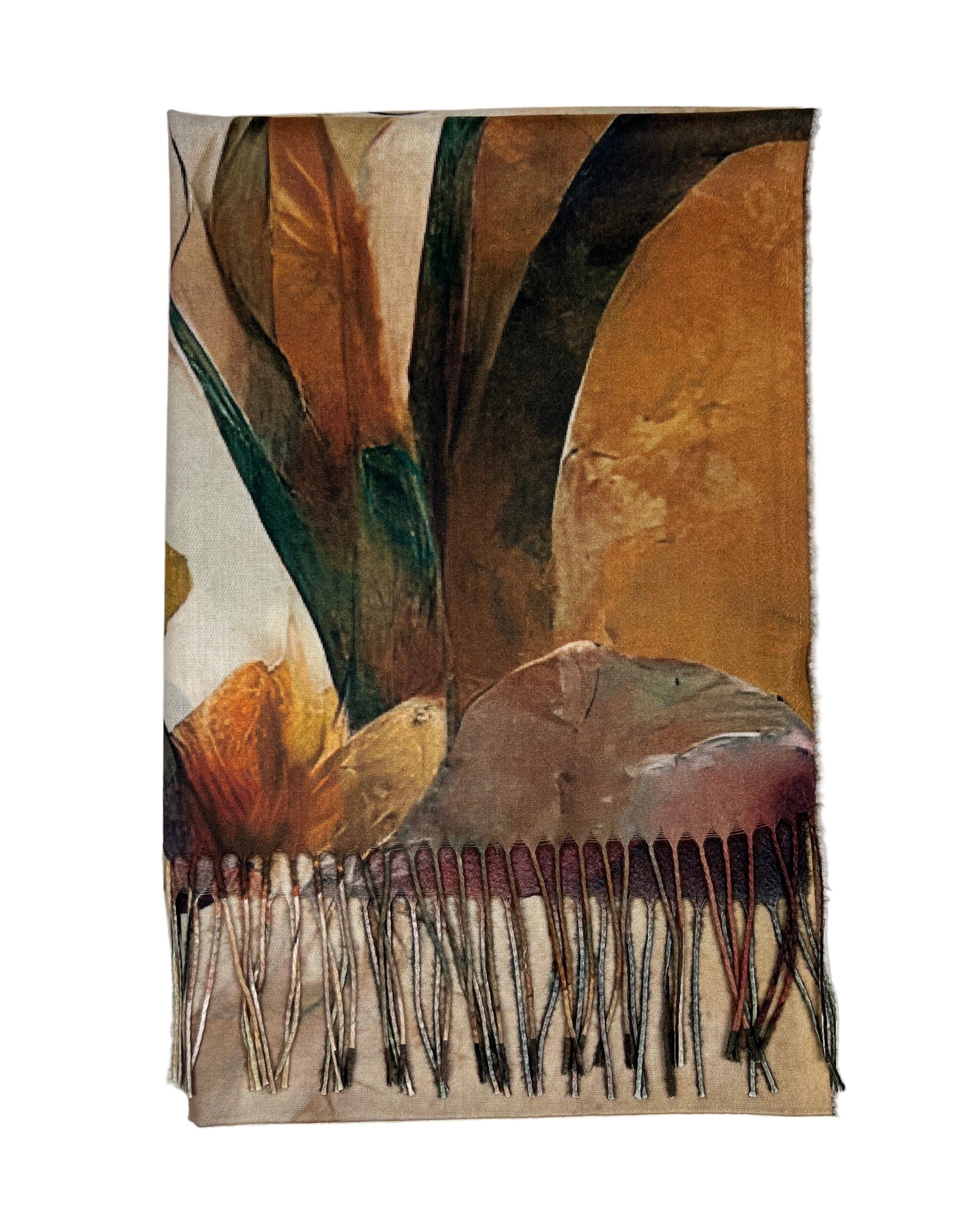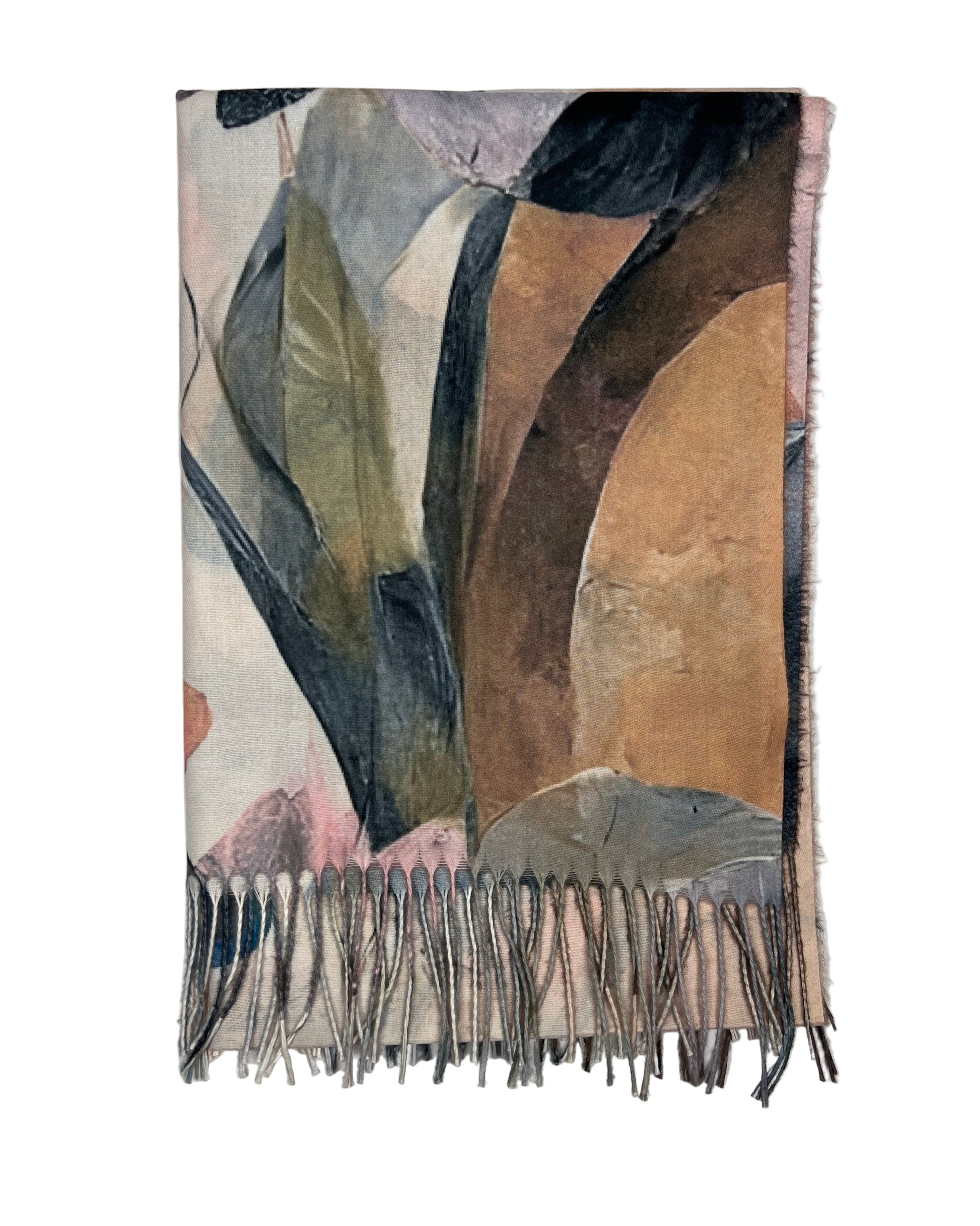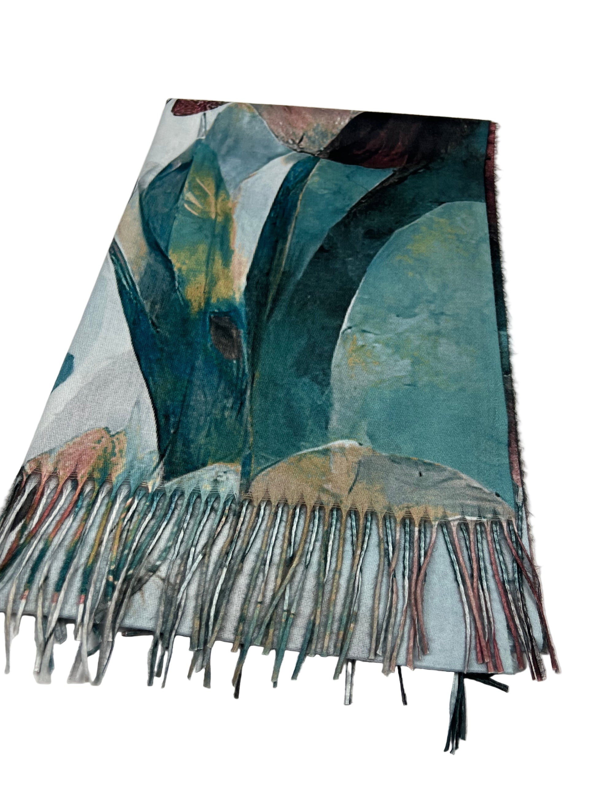Subtilus šalikas su meninio stiliaus gėlių motyvais. Dominuoja melsvos ir bordo spalvos, kurios suteikia elegancijos bei išskirtinumo. Tobulas pasirinkimas prie neutralių tonų aprangos.