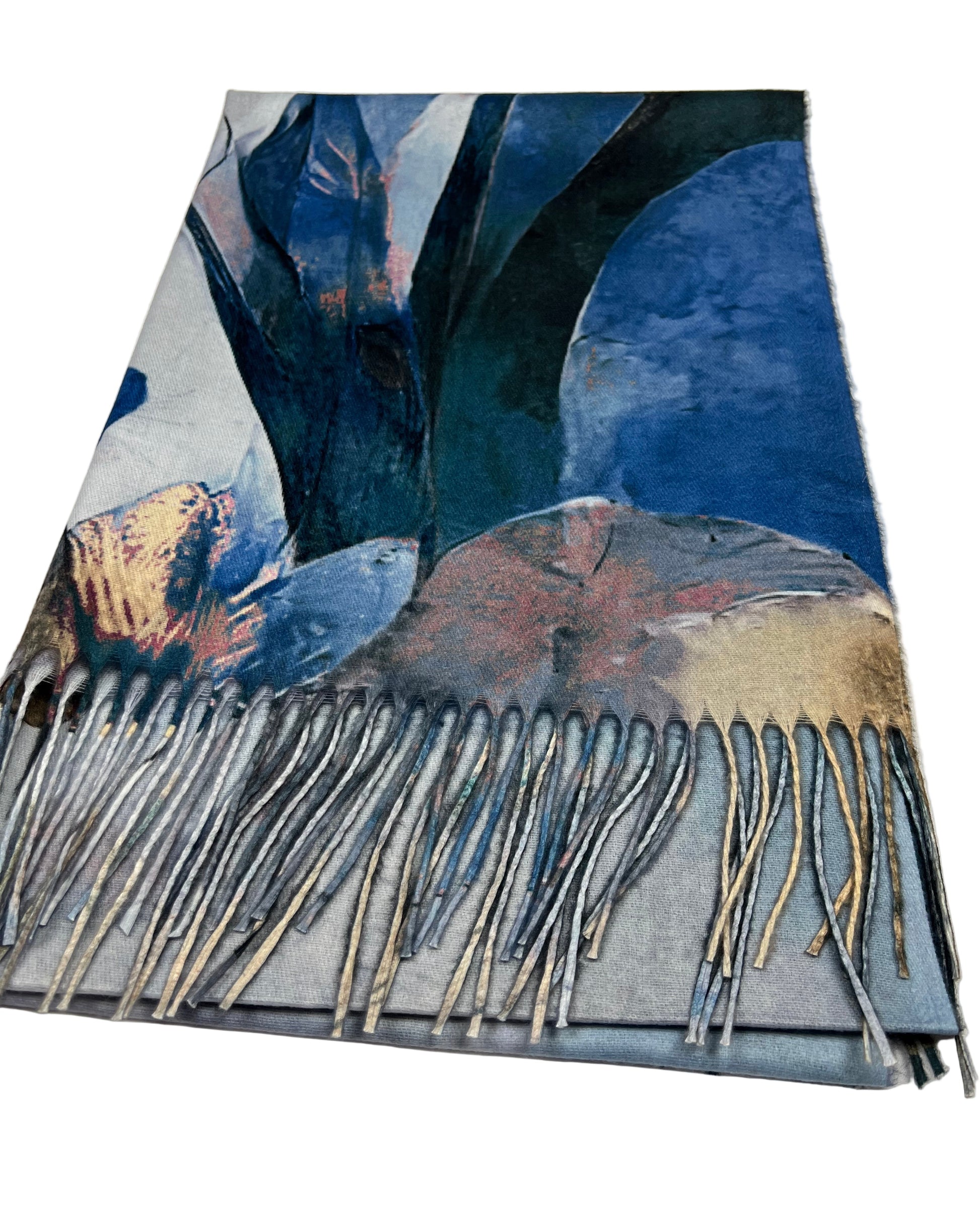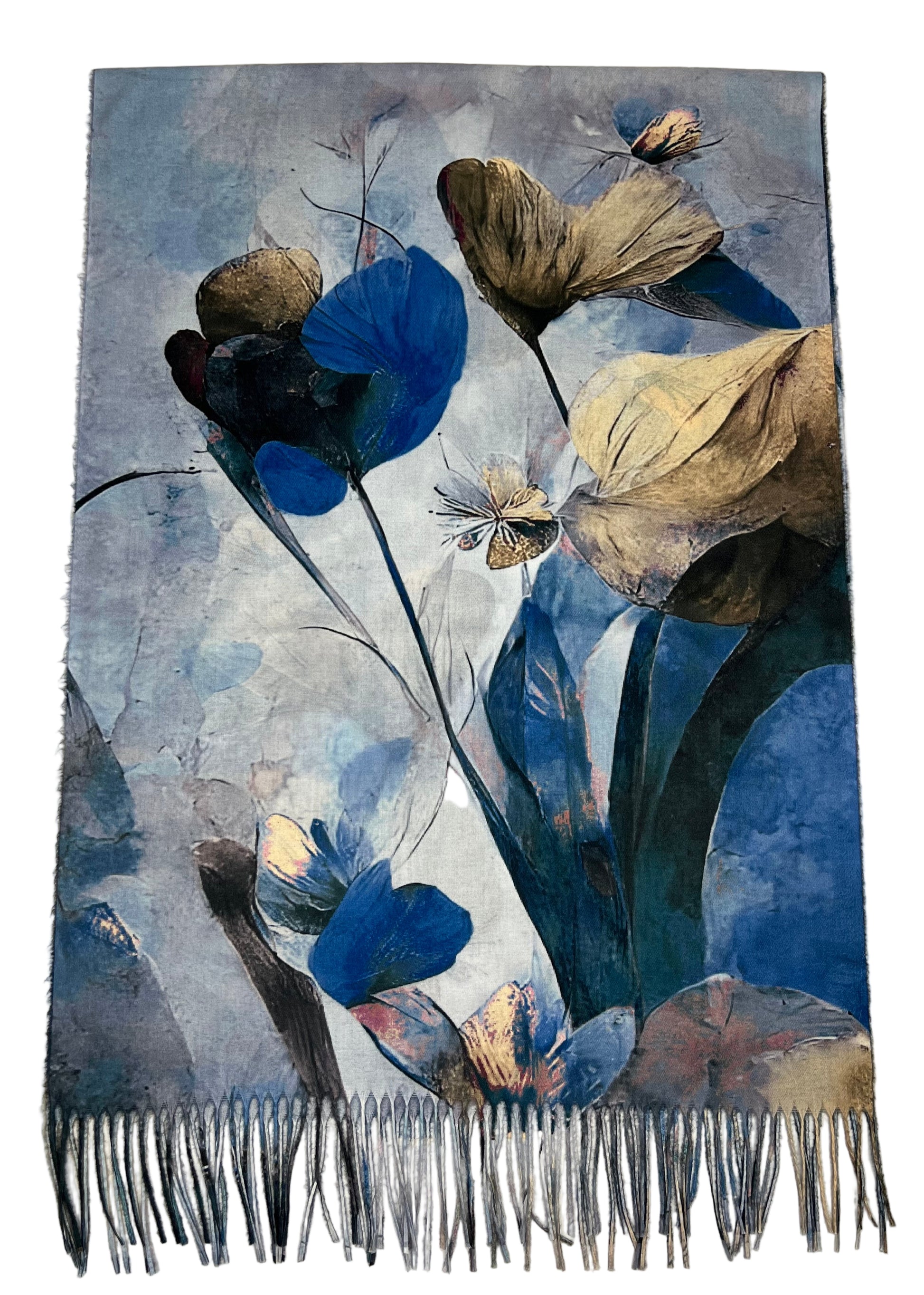 Įspūdingas šalikas mėlynų ir aukso tonų gėlėmis. Sodrios spalvos pabrėžia prabangą ir rafinuotumą – puikus pasirinkimas ypatingiems vakarams.