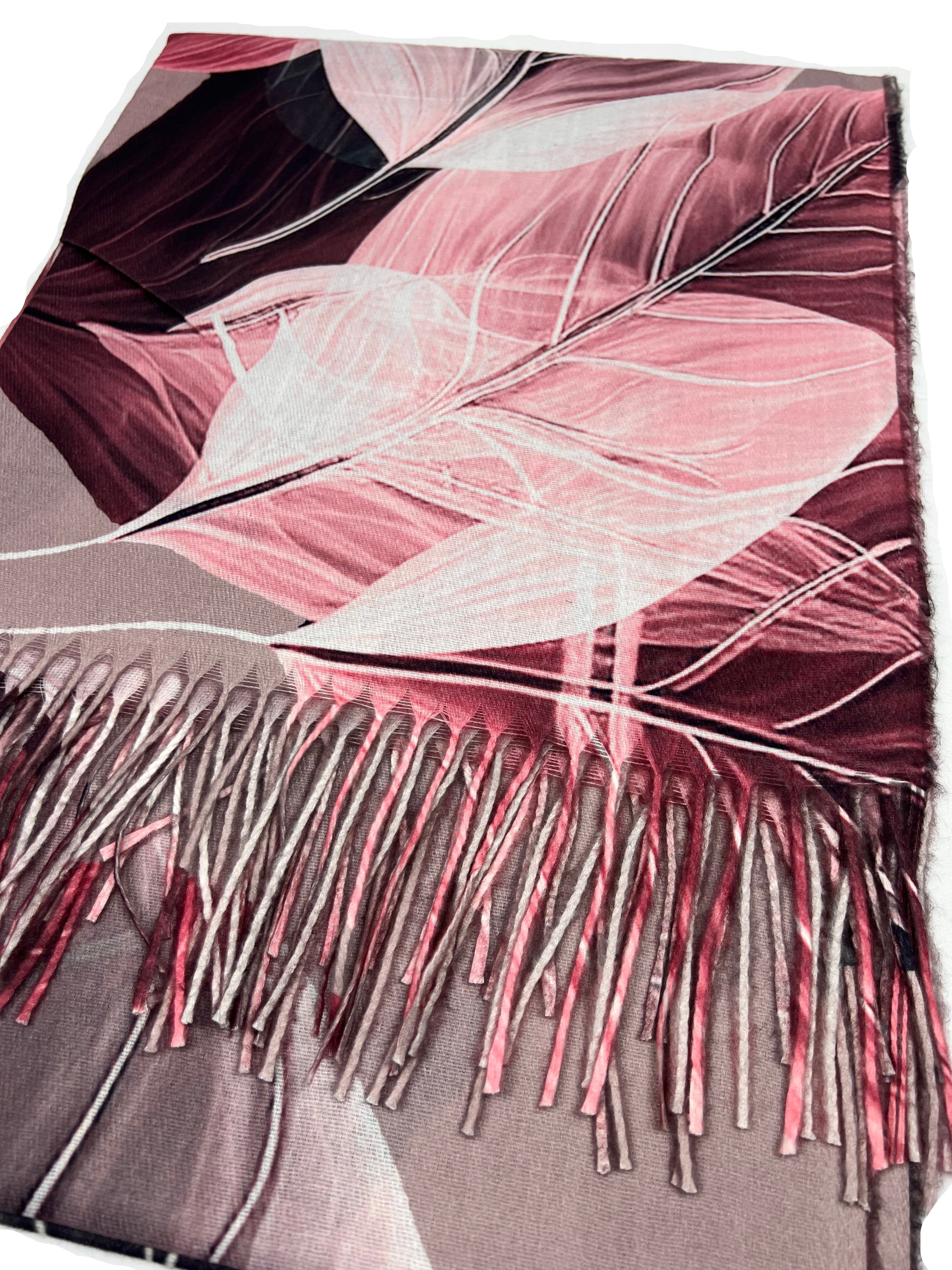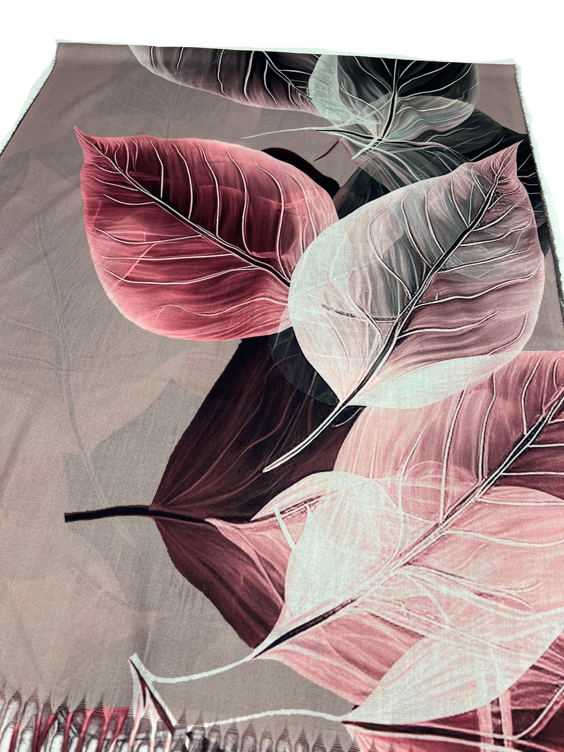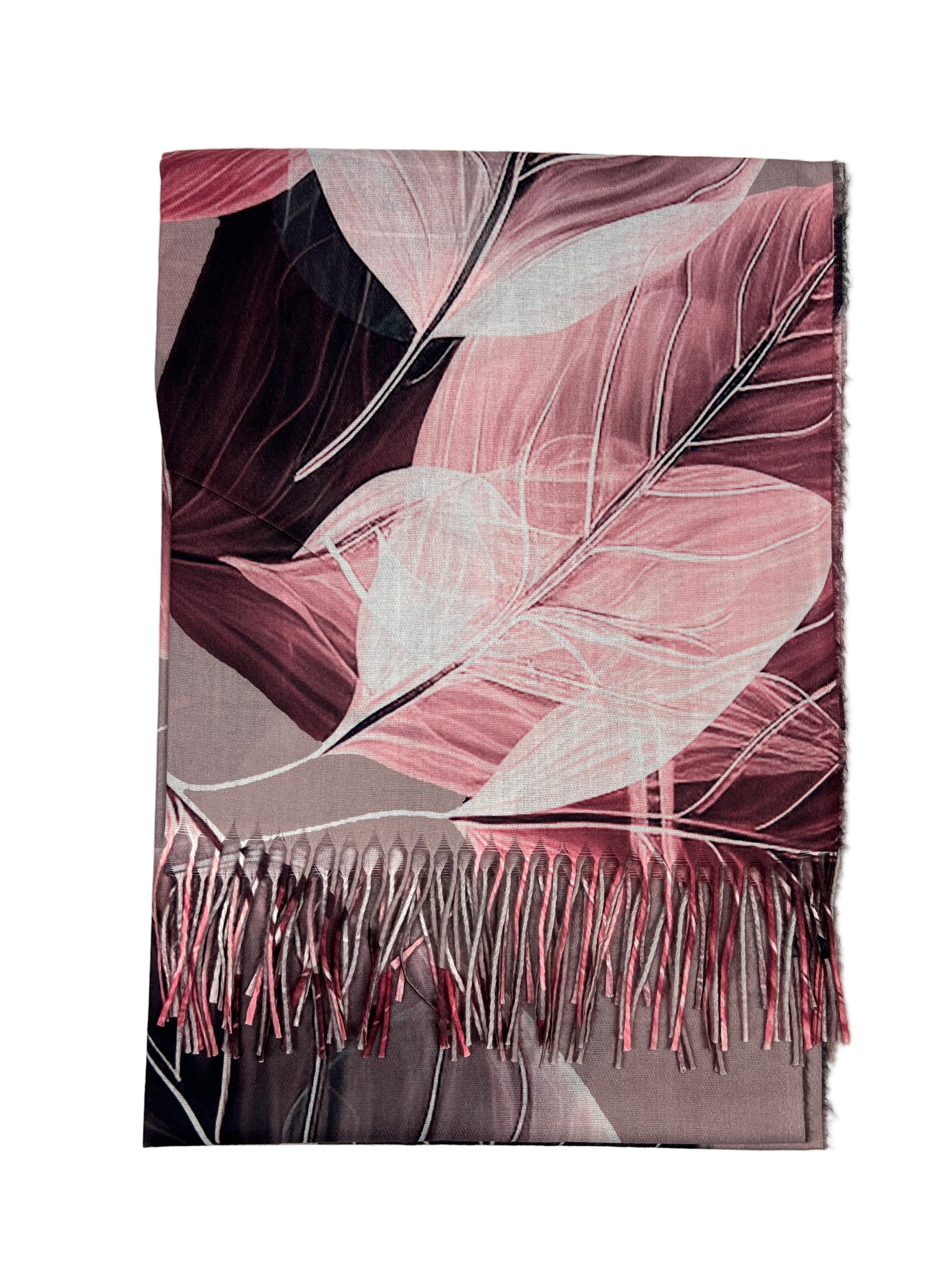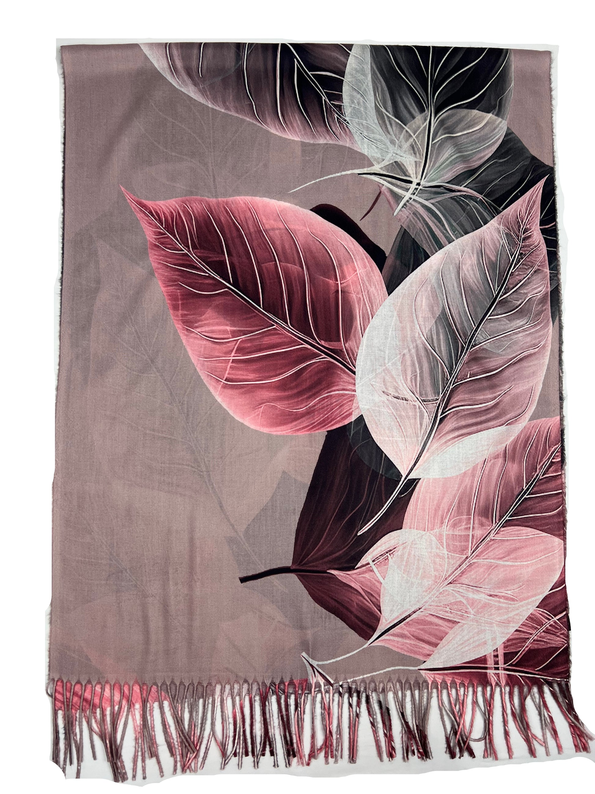 Subtilus rožinis šalikas su tamsesnių bordo lapų motyvais sukuria romantišką ir švelnų stilių. Tai puikus pasirinkimas toms, kurios nori atrodyti moteriškai ir rafinuotai.