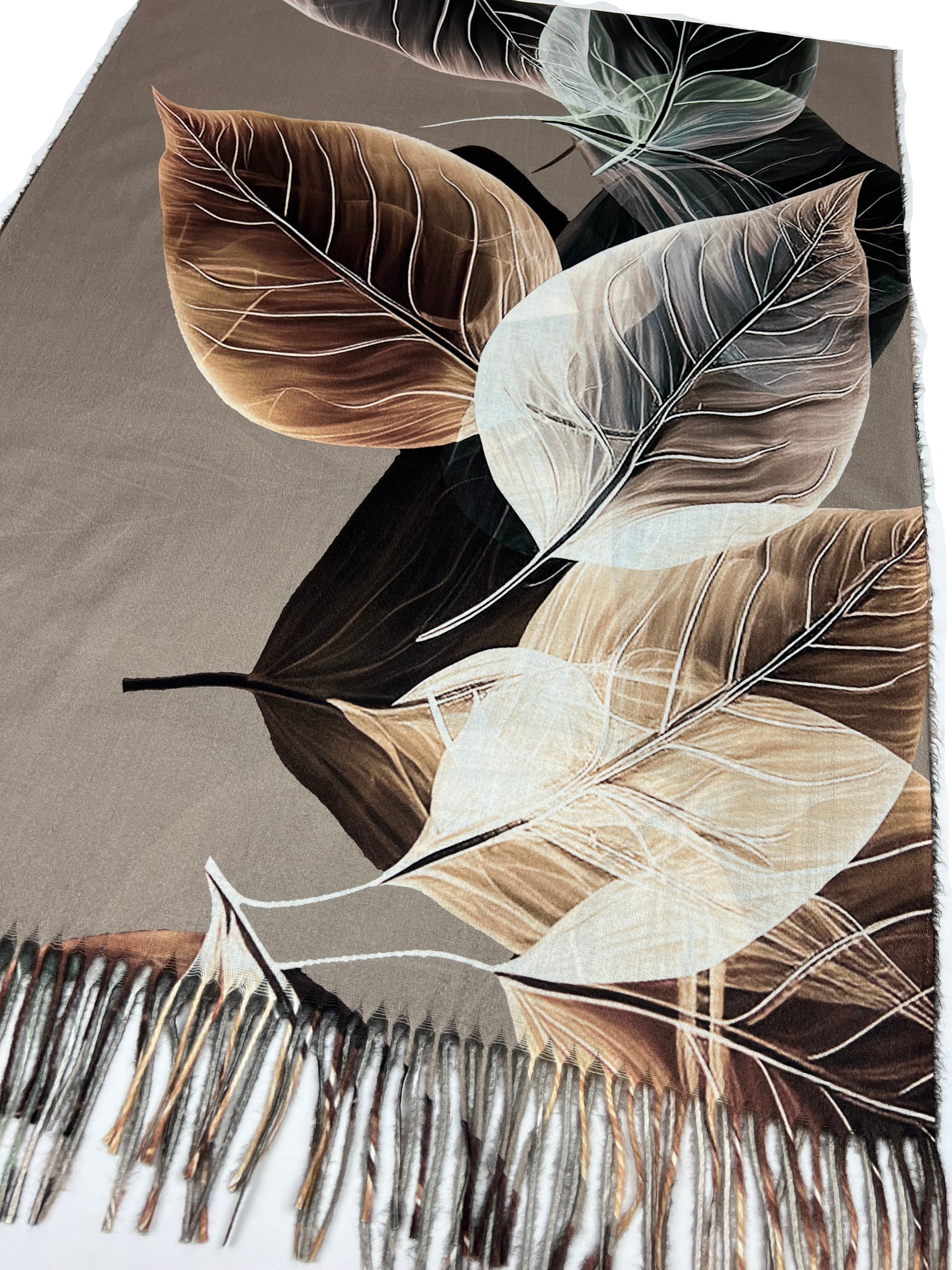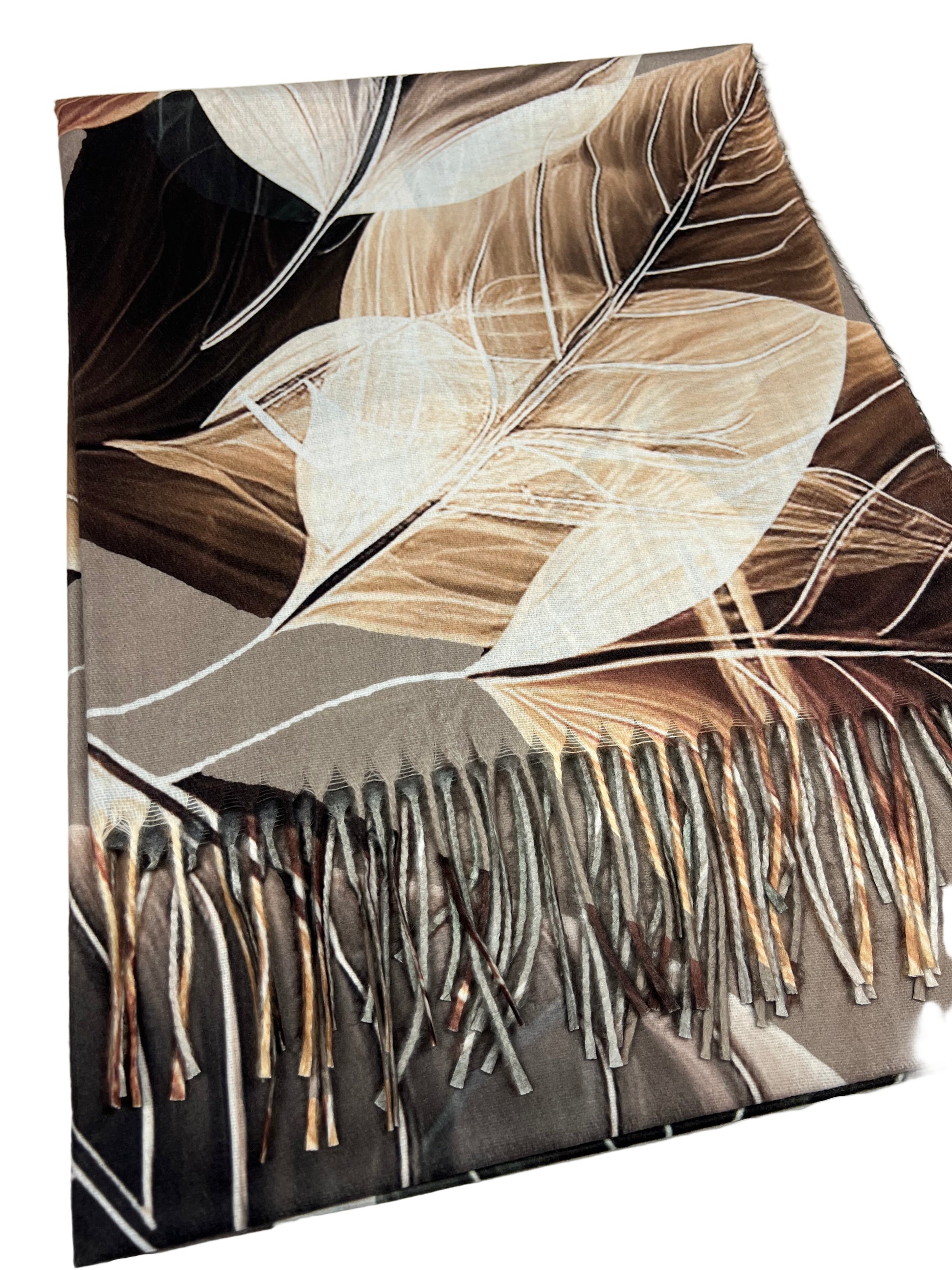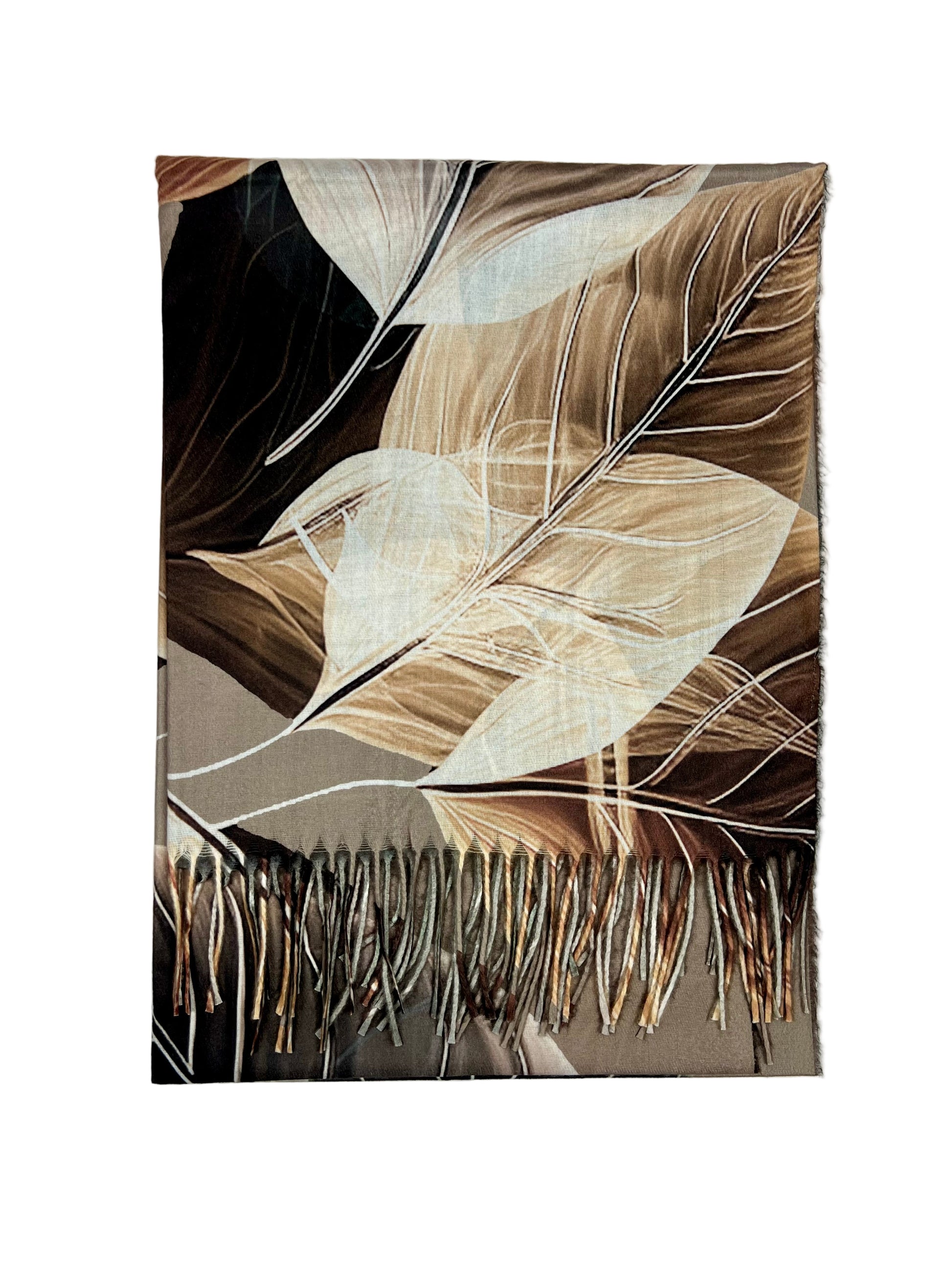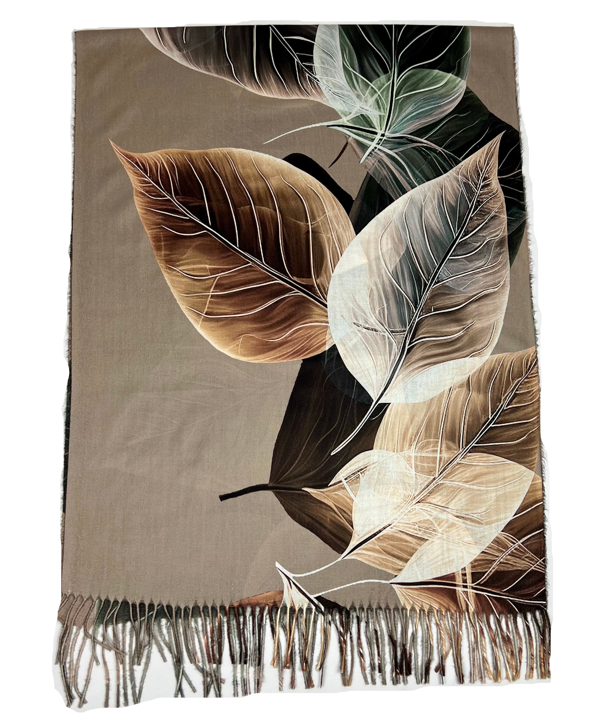 Šis šalikas su smėlio rudos spalvos pagrindu ir šiltų atspalvių lapais primena rudeninį mišką. Natūralios spalvos suteikia jaukumo ir ramybės jausmą, todėl jis taps universaliu jūsų garderobo akcentu.