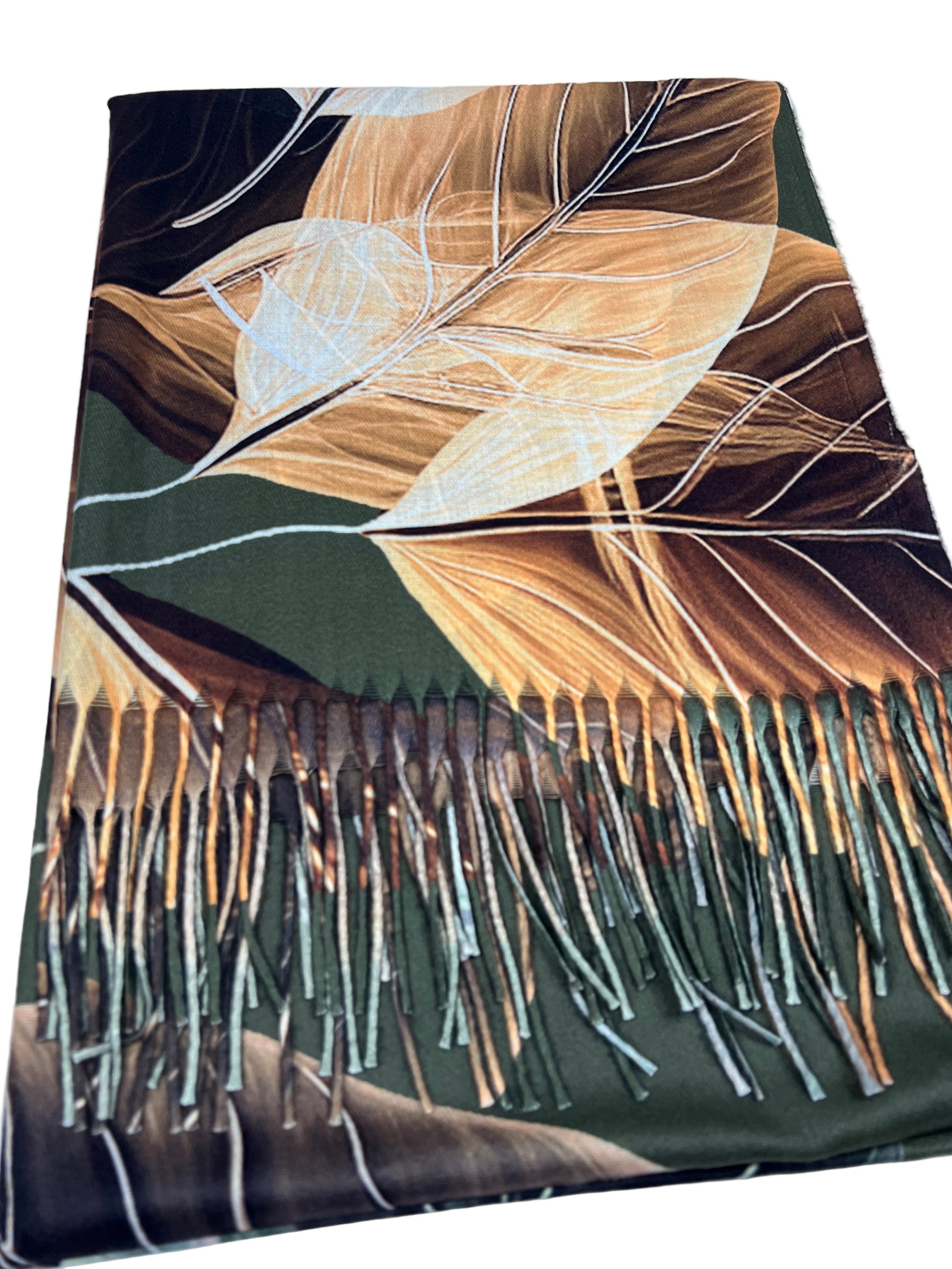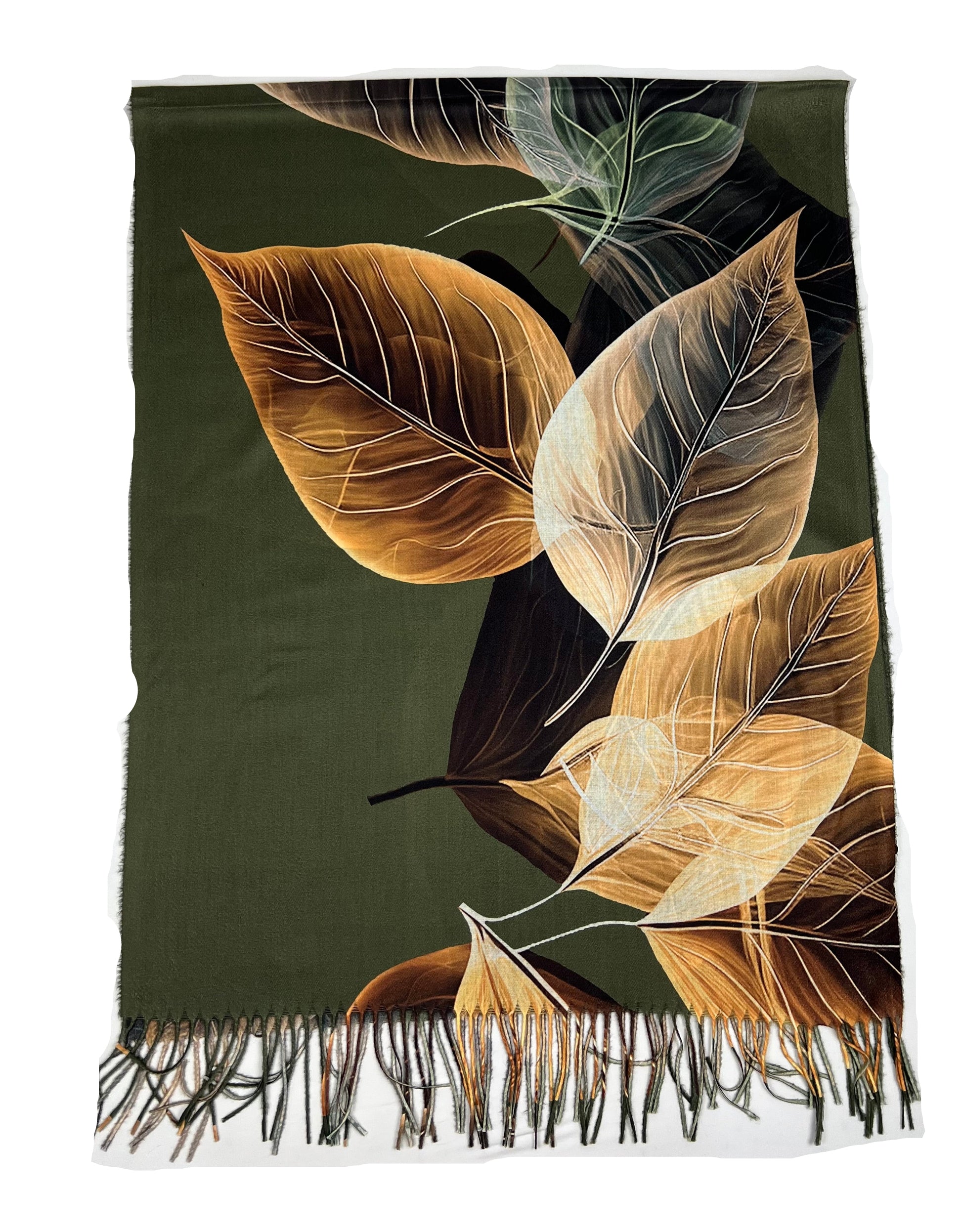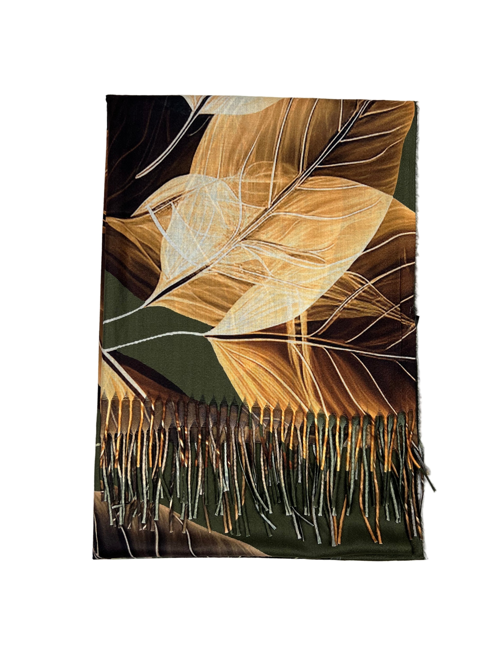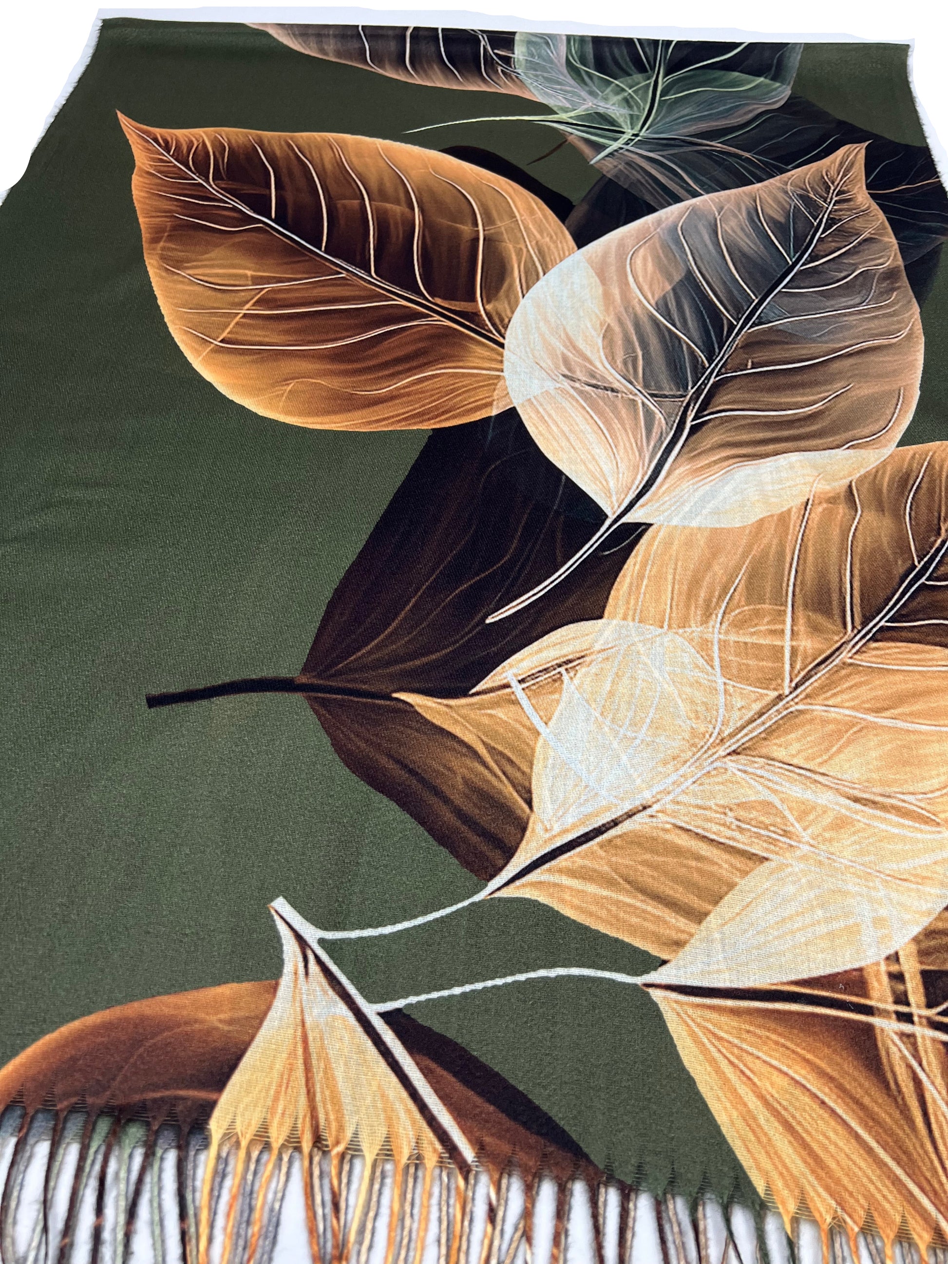 Tamsiai žalio pagrindo šalikas su auksiniais lapais – tikras gamtos grožio ir elegancijos derinys. Tai aksesuaras, kuris išryškina natūralų grožį ir kartu suteikia rafinuotumo.